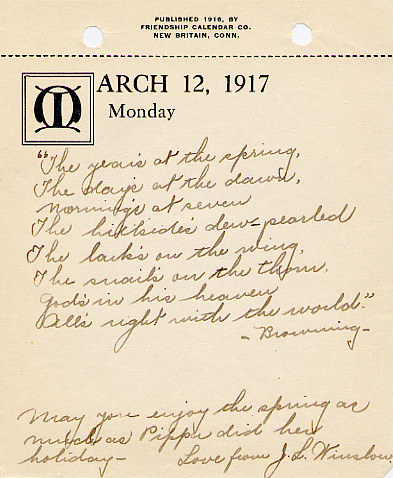 "The year is at the spring, the day's at the dawn, morning's at seven The hillside's dew-pearled The lark's on the wing, The snail's on the thorn, God's in his heaven All's right with the world." |