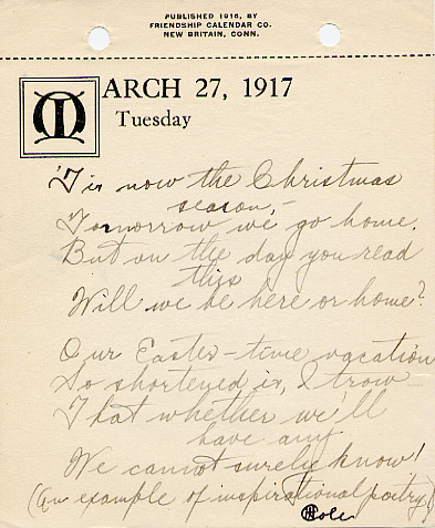 'Tis now the Christmas season, - Tomorrow we go home. But in the day you read this Will we be here or home? Our Easter-time vacation so shortened is, I trow - That whether we'll have any We cannot surely know! (An example of inspirational poetry) |