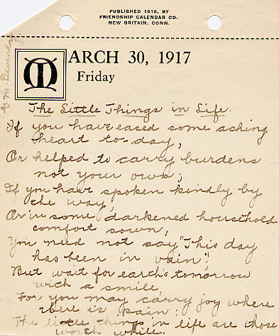 heart to-day, Or helped to carry burdens not your own; If you have spoken kindly by the way, Or in some darkened household comfort sown, You need not say "This day has been in vain"; But wait for earth's tomorrow with a smile, For you may carry joy where there is pain: The little things in life are those worth while. |
