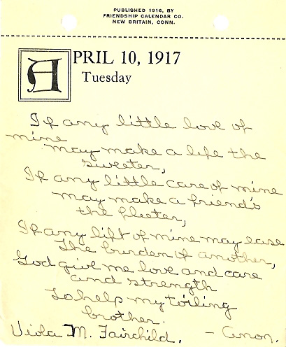 If any little love of mine May make a life the sweeter, If any little care of mine May make a friend's the fleeter, If any lift of mine may ease The burden of another, God give me love and care and strength To help my toiling brother. |