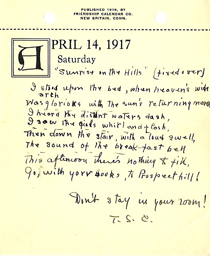 "Sunrise on the Hills" (fixed over) I stood upon the bed, when heaven's wide arch Was glorious with the sun's returning march - - - - - - - - - - - - I heard the distant waters dash, I saw the girls whirl and flash, - - - - - - - - - - - - Then down the stair, with a loud swell, The sound of the break-fast bell - - - - - - - - - - - - This afternoon there's nothing to fill, Go, with your books, to Prospect hill! |