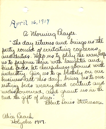 petty round of irritating concerns and duties. Help us to play the man, keep us to perform them with laughter and kind faces, let cheerfulness abound with industry. Give us to go blithely on our business all this day, bring us to our resting beds weary and content and undiscovered, and grant us in the end the gift of sleep." |