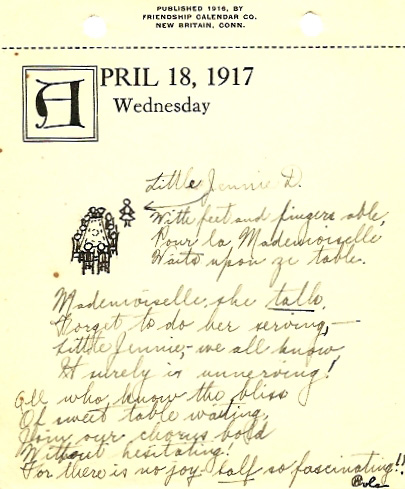 Little Jennie D. With feet and fingers able, Pour la Mademoiselle Waits upon ze table. Mademoiselle, she talk, Forget to do her serving, - Little Jennie, - we all know, It surely is unnerving! All who know the bliss Of sweet table waiting, Join our chorus bold Without hesitating! For there is no joy - half so fascinating!! |