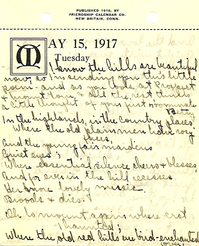 I know the hills are beautiful now, so I'm sending you this little poem - and as you look at Prospect & Mount. Tom, & all the rest, think a little thought of your first roommate |