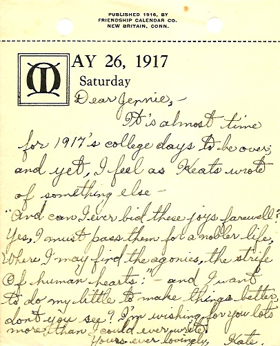 Dear Jennie,- It's almost time for 1917's college days to be over; and yet, I feel as Keats wrote of something else - "And can I ever bid these joys farewell? Yes, I must pass them for a nobler life, Where I may find the agonies, the strife Of human hearts:" - and I want to do my little to make things better, don't you see? I'm wishing for you lots more than I could ever write. |