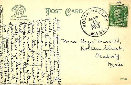 - back Divided back, postmarked Mar 11, 1912 5:30pm in South Hadley. #E3220 Published by The Springfield News Company, Springfield, Mass. A Newvochrome card. "Hello you next door neighbor! I really am too busy to write a letter, so this will have to do for now. This building is where Dr. Patterson lived last year. It's just great out here now. Say, if the people across the way tell you I was homesick two weeks ago don't you believe it. They insist upon saying I was. Will be home with my bunch Tues. 19th. Keep your windows closed if you want any peace then. Lovingly, Marian." [The key to identifying Marian was the "next door neighbor" in Peabody. There were two students at Mount Holyoke from Peabody that year, but only one was named Marian.]