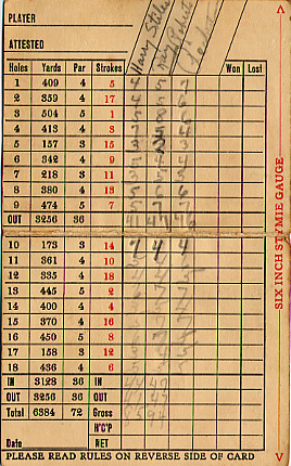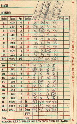 - back Scorecard is six inches in width so that "stymies" could be measured under the rules of golf as they were then. This card has been filled out with scores for four players, including Ben Loving, an area pro who shot 72, and Jimmy Young, who was the club's first pro when it opened in 1922. He shot 80 so either he was up in years or he had other things on his mind (or he couldn't putt....or something, because he was a good player at one time). The Orchards is one of the classic Donald Ross-designed courses and about 15 of the original holes remain true to his architectural style. Ross did the first 9, opened in 1922, and Walter Hatch (one of Ross' several "right hand" men) did the second 9, opened in 1927. The yardage on the card is 6,384 and for years the club had just one set of tees. The yardage from the back tees today is 6,500+.