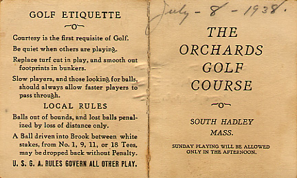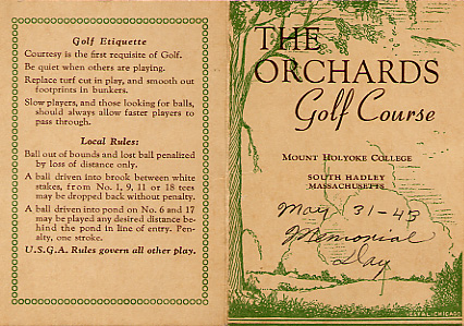 - front "Orchards Golf Course, Inc. The Orchards at Mount Holyoke College South Hadley, Massachusetts." Donated by John E. Sagi of Monmouth Junction, NJ, a premier source of information about golf courses in the United States. Thanks, John!