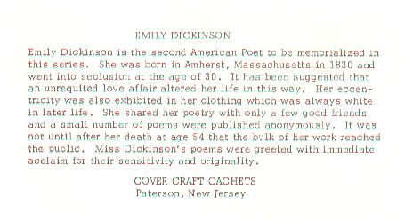 - front Anderson first day cover. "Emily Norcross Dickinson, American Poetess, was born in 1830, at Amherst, Mass. With only the equivalent of a high school education she gained a wealth of words by reading the dictionary, page by page as one would read a novel. Although few of her poems were published during her lifetime, her work has enjoyed mounting critical acclaim in recent years. After her death in 1886 some 2000 poems were found tucked away in a bureau; fifty or so were great poems."