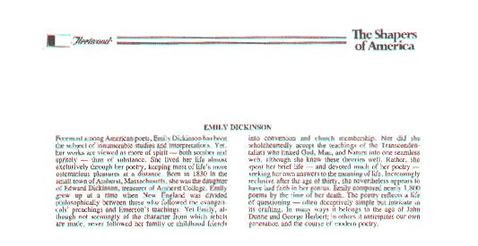 - front "Emily Norcross Dickinson, American poetess, was born in 1830, at Amherst, Mass. With only the equivalent of a high school education she gained a wealth of words by reading the dictionary, page by page as one would read a novel. Although fewof her poems were published during her lifetime, her work has enjoyed mounting critical acclaim in recent years. After her death in 1886 some 2000 poems were found tucked away in a bureau; fifty or so were great poems."