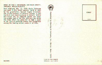 - back "Home of Emily Dickinson, 280 Main Street, Amherst, Massachusetts. Near midnight, Dec. 10, 1830, Emily Dickinson was born in this brick mansion. Built in 1813 by her grandfather, Samuel Fowler Dickinson, one of the founders of Amherst College, it was the first brick dwelling-house in Amherst. Within this house and its adjacent garden she spent the greater part of her life, and here she wrote the verse which has given her so high a place in the field of American letters and recognition among the leading women poets of all time." Divided back, stamp box, unused. Published by Bromley & Co, Boston MA. Color by Mike Roberts, Berkeley, CA. #MA1085, #C8897 in stamp box.