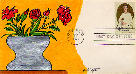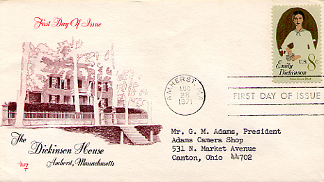In 1971, an Emily Dickinson stamp was issued by the US Postal service. On the first day of issue, several kinds of envelopes were stamped and postmarked with the new stamp. All are postmarked Aug 28, 1971 in Amherst, MA and are stamped with an 8-cent Emily Dickinson stamp with a "First Day of Issue" postmark unless otherwise noted.