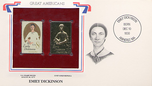 - front The FDC contains a gold replica of the Emily Dickinson stamp next to an encapsulated real stamp. A biography (not scanned here) is included on the back.