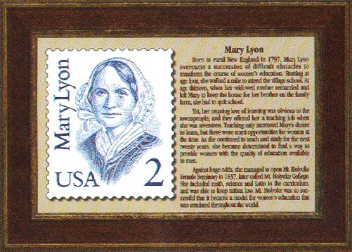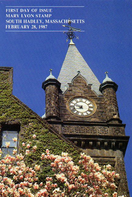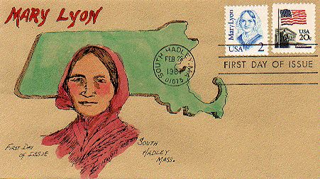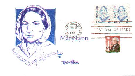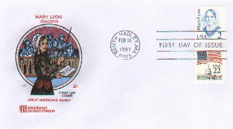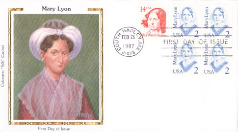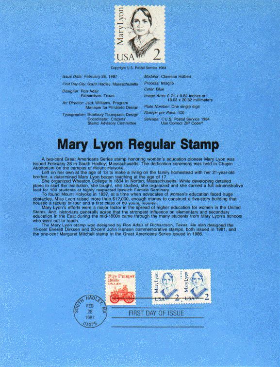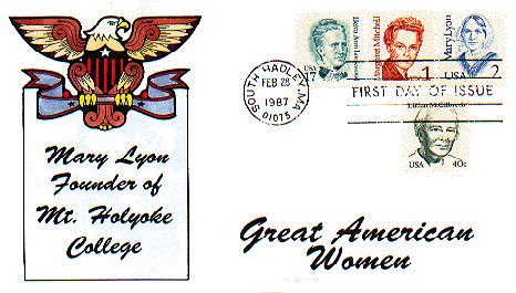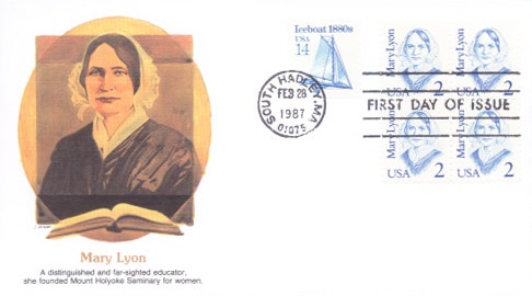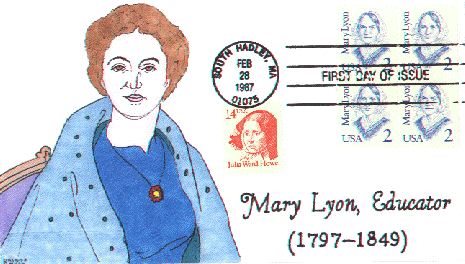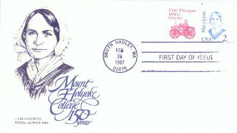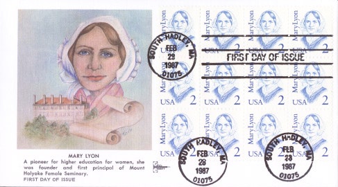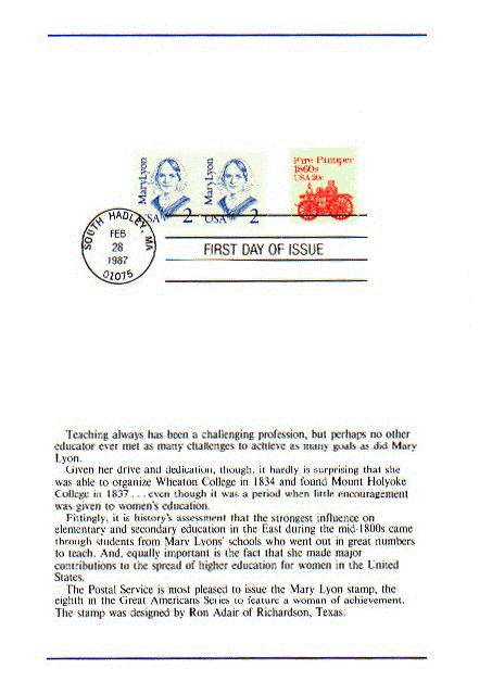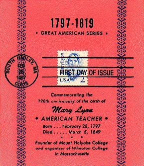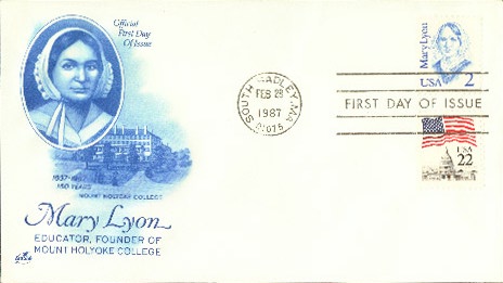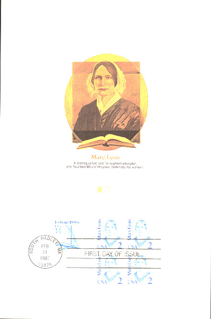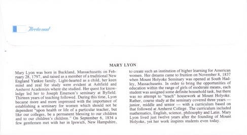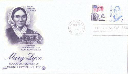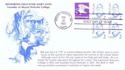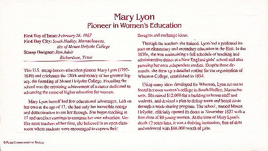 - supplement This card was packaged with this first day cover. "This U.S. stamp honors education pioneer Mary Lyon (1797-1849) and celebrates the 150th anniversary of her greatest legacy, the founding of Mount Holyoke College. Founding the school was the crowning achievement of a career dedicated to advancing the cause of higher education for women. Mary Lyon herself had few educational advantages. Left on her own at the age of 13, she had only her incredible energy and determination to see her through. She began teaching at 17 and used her earnings to continue her own education. Unlike most teachers of her time, she believed in an open classroom where students were encouraged to express their thoughts and exchange ideas. Through the teachers she trained, Lyon had a profound impact on elementary and secondary education in the East. In the 1830s, she was maintaining a full schedule of teaching and administrative duties at a New England girls' school and also pursuing her own independent studies. Despite these demands, she drew up a detailed outline for the organization of Wheaton College, established in 1834. Using many ideas developed for Wheaton, Lyon set out to found her own women's college in South Hadley, Massachusetts. She raised $12,000 for a building to house staff and students, and devised a plan to defray room and board costs through a work-sharing program. The school, named Mount Holyoke, officially opened its doors in November 1837 with a first class of 80 young women. At the time of Mary Lyon's death 12 years later, it was a thriving institution, free of debt and endowed with $68,000 worth of gifts."