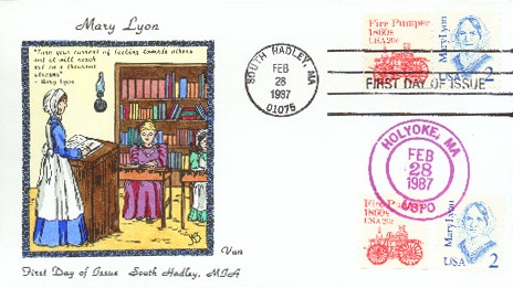 - front "Mary Lyon First Day of Issue South Hadley, MIA [sic]" A hand-painted picture signed "Van." A quote by Mary Lyon above it reads: "Turn your current of feeling towards others and it will reach out in a thousand streams." Stamped with two 20-cent fire pumper stamps, and two 2-cent Mary Lyon stamps.