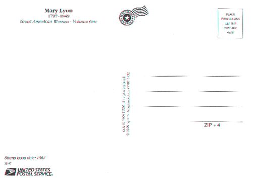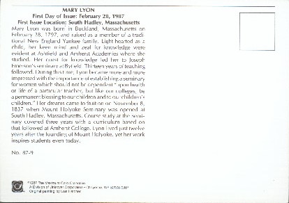 - front Divided back, stamp box, unused. #87-9 "Mary Lyon was born in Buckland, Massachusetts on February 28, 1797, and raised as a member of a traditional New England Yankee family. Light-hearted as a child, her keen mind and zeal for knowledge were evident at Ashfield and Amherst Academies where she studied. Her quest for knowledge led her to Joseph Emerson's seminary at Byfield. Thirteen years of teaching followed. During this time, Lyon became more and more impressed with the importance of establishing a seminary for women which should not be dependent "upon health or life of a particular teacher, but like our colleges, be a permanent blessing to our children and to our children's children." Her dreams came to fruition on November 8, 1837 when Mount Holyoke Seminary was opened at South Hadley, Massachusetts. Course study at the Seminary covered three years with a curriculum based on that followed at Amherst College. Lyon lived just twelve years after the founding of Mount Holyoke, yet her work inspires students even today."