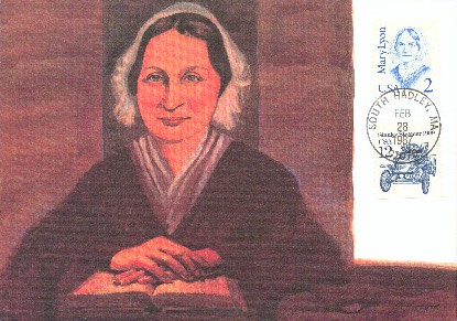 - front A postcard with a painted portrait of Mary Lyon by Lois Hatcher. Produced by The Maximum Card Collection. Also stamped with a 12-cent Stanley Steamer stamp.