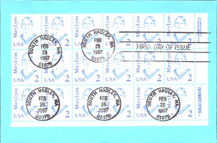 - front A blue envelope containing 18 Mary Lyon stamps, postmarked First Day of Issue, Feb 28, 1987 in South Hadley.