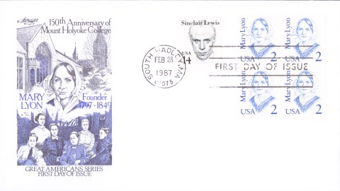 - front Artmaster FDC. "150th Anniversary of Mount Holyoke College - Mary Lyon - Founder 1797-1849 - Great Americans Series First Day of Issue". Block of four Mary Lyon stamps, plus a 14c Sinclair Lewis stamp.