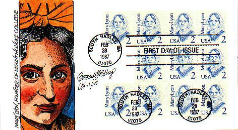 - front "Mary Lyon Mount Holyoke College" "First Day of Issue Feb. 28, 1987 South Hadley, MA" Handpainted by Collins. Stamped with eleven 2-cent Mary Lyon stamps.
