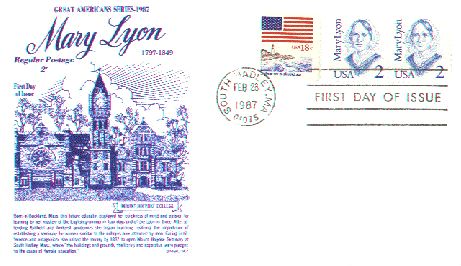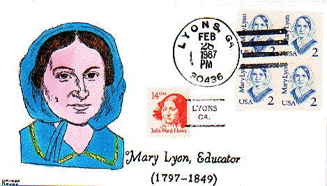 - front "Mary Lyon, Educator (1797-1849)." Hand painted by Kripps Kover. Postmarked Feb 28, 1987 in Lyons, GA. Stamped with four 2-cent Mary Lyon stamps, and a 14-cent Julia Ward Howe stamp.