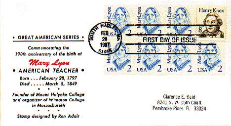 - front "Great American Series Commemorating the 190th anniversary of the birth of Mary Lyon American Teacher Born February 28, 1797 Died March 5, 1849 Founder of Mount Holyoke College and organizer of Wheaton College in Massachusetts. Stamp designed by Ron Adair." Stamped with seven 2-cent Mary Lyon stamps, and an 8-cent Henry Knox stamp. Addressed to Clarence Reid.