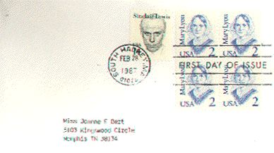 - front Stamped with four 2-cent Mary Lyon stamps, and a 14-cent Sinclair Lewis stamp. Addressed to Joanne E. Bert.