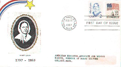 - front "Mary Lyon 1797-1849 American Educator, Advocate for Womens Rights, Founder of Mount Holyoke College, Mass." Stamped with one 2-cent Mary Lyon stamp, and a 22-cent flag stamp.