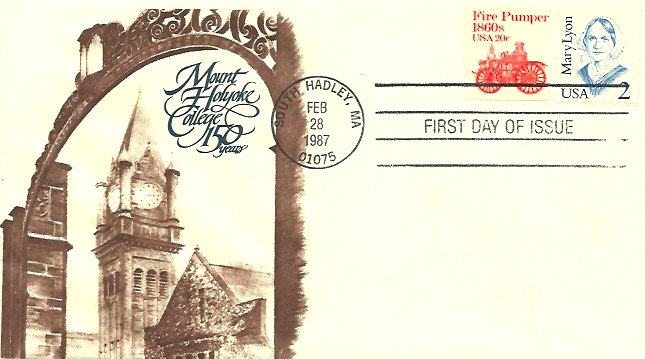 - front "Mount Holyoke College 150 years" Stamped with a Mary Lyon 2c stamp, and a Fire Pumper 20c stamp.