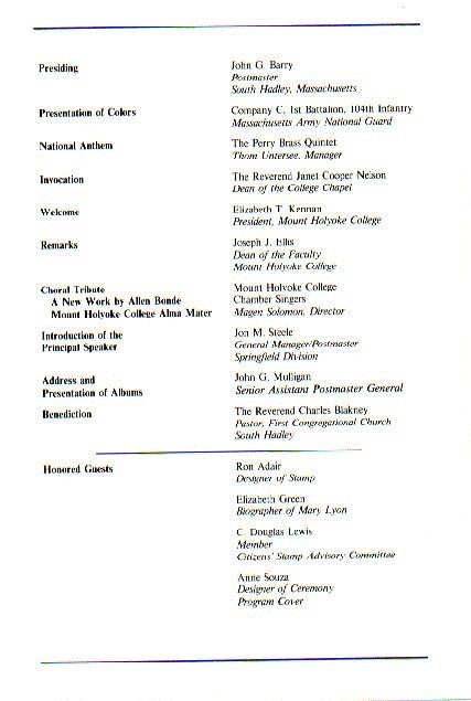 - page 1 The cover of the program distributed at the first day of issue of the Mary Lyon Stamp. February 28, 1987 in South Hadley.