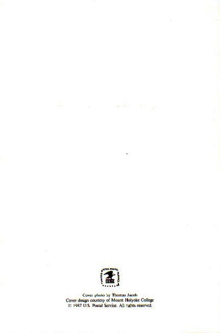 In 1987, to commemorate the sesquecentennial of MHC, a Mary Lyon stamp was issued by the US Postal service. On the first day of issue, several kinds of envelopes were stamped and postmarked with the new stamp. All covers on this page were postmarked Feb 28, 1987 in South Hadley with a "First day of issue" postmark, and have a 2-cent Mary Lyon stamp on them, unless otherwise noted.