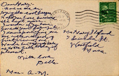 - back Undivided back, postmarked Aug 7, 1944 3pm in Charlemont, MA. "Dear Mary:- Here we are enjoying the cool breezes. Hope you have survived the heat wave. I wonder if you have gone to your farm yet. I saw a porcupine one eve in the orchard, my first view of one. Ward is here & going to take us to the Falls today if pleasant. With love Belle. Mon. A. M."