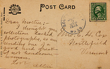 - back Divided back, stamp box, postmarked Jun 9, 1914 12:30pm in South Hadley. #F3273. Published by A. S. Kinney, So. Hadley, Mass. Made in Germany. "Dear Mother :- I thought your collection lacked photographs, so am sending one of a good and great - if not handsome - woman. Love Allie"