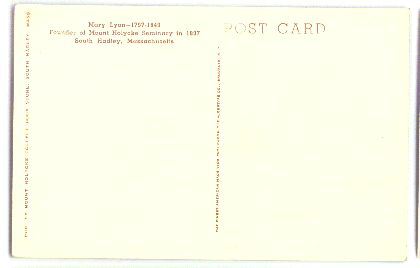 - back Divided back. "Mary Lyon - 1797-1849 Founder of Mount Holyoke Seminary in 1837 South Hadley, Massachusetts" Published by Mount Holyoke College Book Store, South Hadley, Mass, but also marked by the The Albertype Co, Brooklyn, N. Y. Unused.