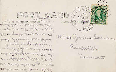 - back Divided back, postmarked Mar 9, 1908 12midnight in South Hadley. "I did not know whether to send this to Essex or not but finally decided not to. It seems good to be back here and I know more people than I supposed I would. Went to some good plays in N.Y. but not to the one you spoke about, wish I might have. A.C.M. Monday A.M."