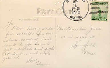 - back Divided back, postmarked Jun 1, 1943 2pm in Buckland. "Hi, We're having wonderful weather for our short vacation. Can't wait to get home to get weighed and sigh at how much I've gained. Love Alice"