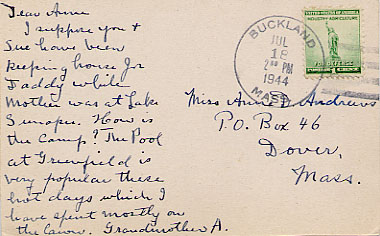 - back Divided back, postmarked Jul 18, 1944 2pm in Buckland. "Dear Anne I suppose you & Sue have been keeping house for Daddy while Mother was at Lake Sunapee. How is the Camp? The Pool at Greenfield is very popular these hot days which I have spent mostly on the lawn. Grandmother A."
