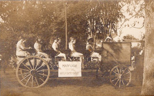 - front A group of young women in a carriage, perhaps for a parade, with a sign that reads "Mary Lyon Starting Wheaton Seminary"