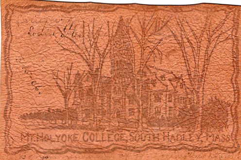 - front A leather card depicting Mary Lyon Hall. Inscription: "Do you remember of your seeing this place? Lovingly Louise Gles[...] 5-15-06."