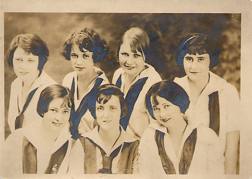 - front Peabody basketball team; inscription under their shoes spells "CHAMPS '21". Inscription on back: "L to R/Nell Crain/Bernice Huggins/Ethel Gentry/Leota (Blackie) Williams/Genevieve Collins/Ethel (Toby) Norton Coach"