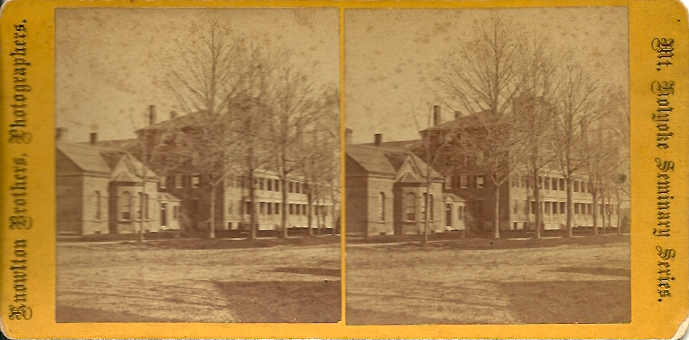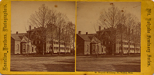- front "Knowlton Bros., Photographers. Mt. Holyoke Seminary Series." Back is plain yellow, inscription: "Mt. Holyoke Seminary So. Hadley, Mass."