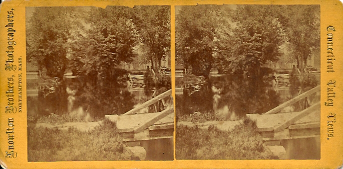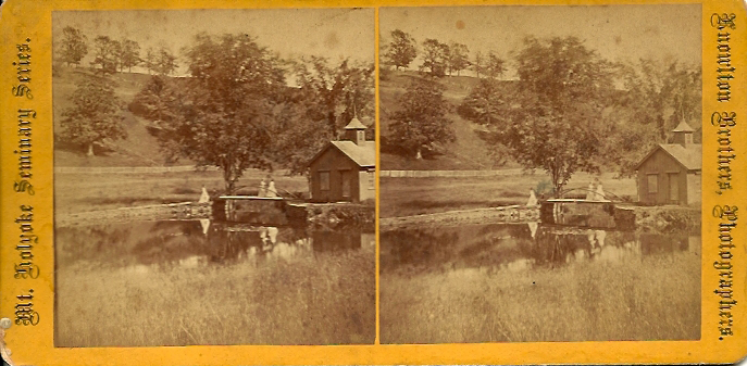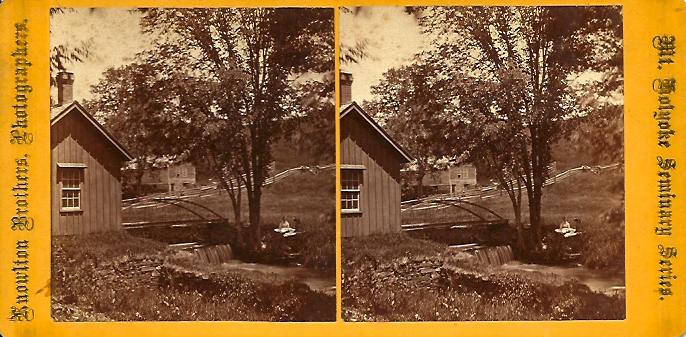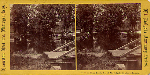 - front "Mt. Holyoke Seminary Series" "Knowlton Brothers, Photographers." Pump house and bridge; two women stand on the bridge; Prospect Hill visible in the background. Very similar to previous stereo, but it's cropped differently. Inscription on reverse: "View on Stony Brook, foot of Mt Hol Sem grounds"