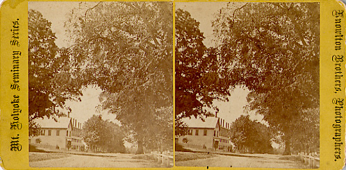 - front "Mt. Holyoke Seminary Series" "Knowlton Brothers, Photographers" Seminary Hall in the background; Dwight homestead in the foreground. Plain yellow back. Inscriptions on back: "Bliss" and "Street in So. Hadley"