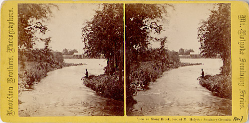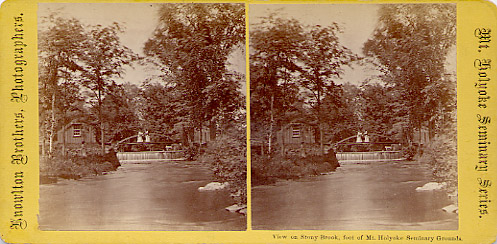 - front "View on StonyBrook, foot of Mt. Holyoke Seminary Grounds." Knowlton Brothers, Photographers. Mt. Holyoke Seminary Series. Back is plain yellow, no markings.