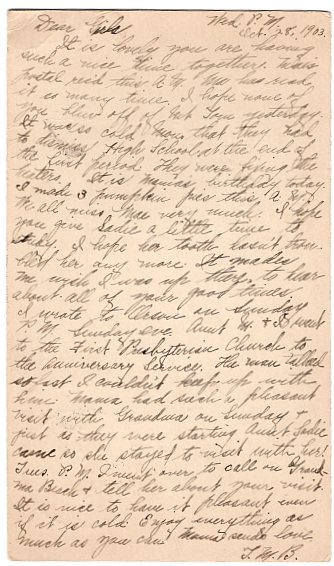 - back Undivided back. "Wed. P.M. Oct. 28, 1903. Dear Girls, It is lovely you are having such a nice time together. Mae's postal rec'd this A.M. Ma has read it so many time[s]. I hope none of you blew off of Mt. Tom yesterday. It was so cold Mon. that they had to dismiss High School at the end of the first period. They were fixing the heaters. It is Mama's birthday today. I made 3 pumpkin pies this A.M. We all miss Mae very much. I hope you give Sadie a little time to study. I hope her tooth hasn't troubled her any more. It made me wish I was up there, to hear about all of your good times. I wrote to Orson on Sunday P.M. Sunday eve. Aunt M. & I went to the First Presbyterian Church to the Anniversary Service. The man talked so fast I couldn't keep up with him. Mama had such a pleasant visit with Grandma on Sunday & just as they were starting Aunt Sadie came so she stayed to visit with her. Tues. P.M. I went over to call on Grandma Beach & tell her about your visit. It is nice to have it pleasant even if it is cold. Enjoy everything as much as you can. Mama sends love. T.M.B."