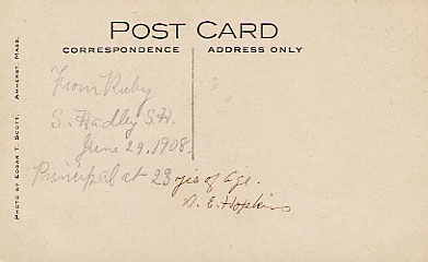 - back Divided back, postally unused, but inscribed: "From Ruby S. Hadley S. H. [School House] June 24, 1908. Principal at 23 yrs of age. A. E. Hopkins" Photo by Edgar T. Scott, Amherst, Mass.