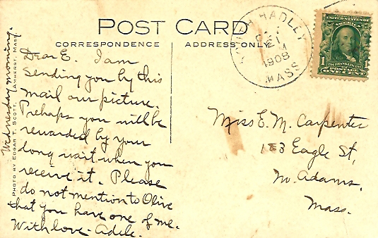 - back Divided back, postmarked Oct 21, 1908 in South Hadley. Photo by Edgar T. Scott, Amherst, Mass. "Wednesday morning. Dear E. I am sending you by this mail our picture. Prehaps [sic] you will be rewarded by your long wait when you receive it. Please do not mention to Olive that you have one of me. With love. Adele."