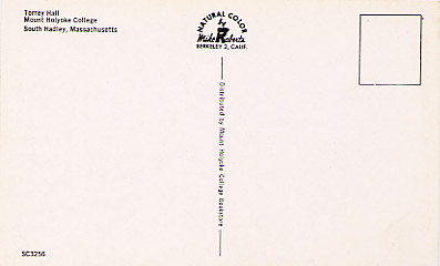 - back "Torrey Hall Mount Holyoke College South Hadley, Massachusetts" Divided back, stamp box, unused. The fact that this card identifies the building as Torrey Hall, and doesn't have a zip code, dates this card somewhere between 1956 and 1963. #SC3256 A Natural Color Card by Mike Roberts, Berkeley 2, Calif. Distributed by Mount Holyoke College Bookstore.