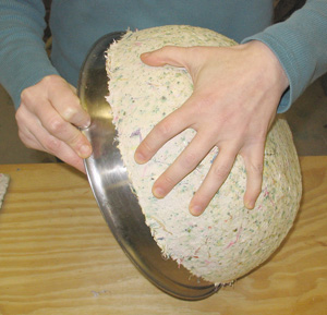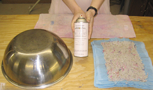 The metal bowl will be the mould that I use for creating the paper bowl. The can I'm holding is mould release spray; I've read that Pam cooking spray works fine too, though I've been hesitant to try it, thinking it will leave oily residue on the paper. But it certainly would be a lot less expensive. I bought my mould release spray from papermaking.net. And the pile of handmade paper is stacked between shop towels in the right hand side of the photo. Note that they are still wet. They are freshly made, and should not be allowed to dry before making the bowl. | ||||||||