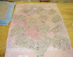 Now you're ready to start making the bowl. Each sheet of paper has two sides to it: one side that shows the screening of the paper mould, and one side that shows the texture of the shop towel. I think the texture of the shop towel is more appealing than the screening, so I lay the torn pieces of paper with the towel-texture down. Overlap the pieces as you go. Pat the seams down with your fingers. Make sure all of the bowl gets covered.